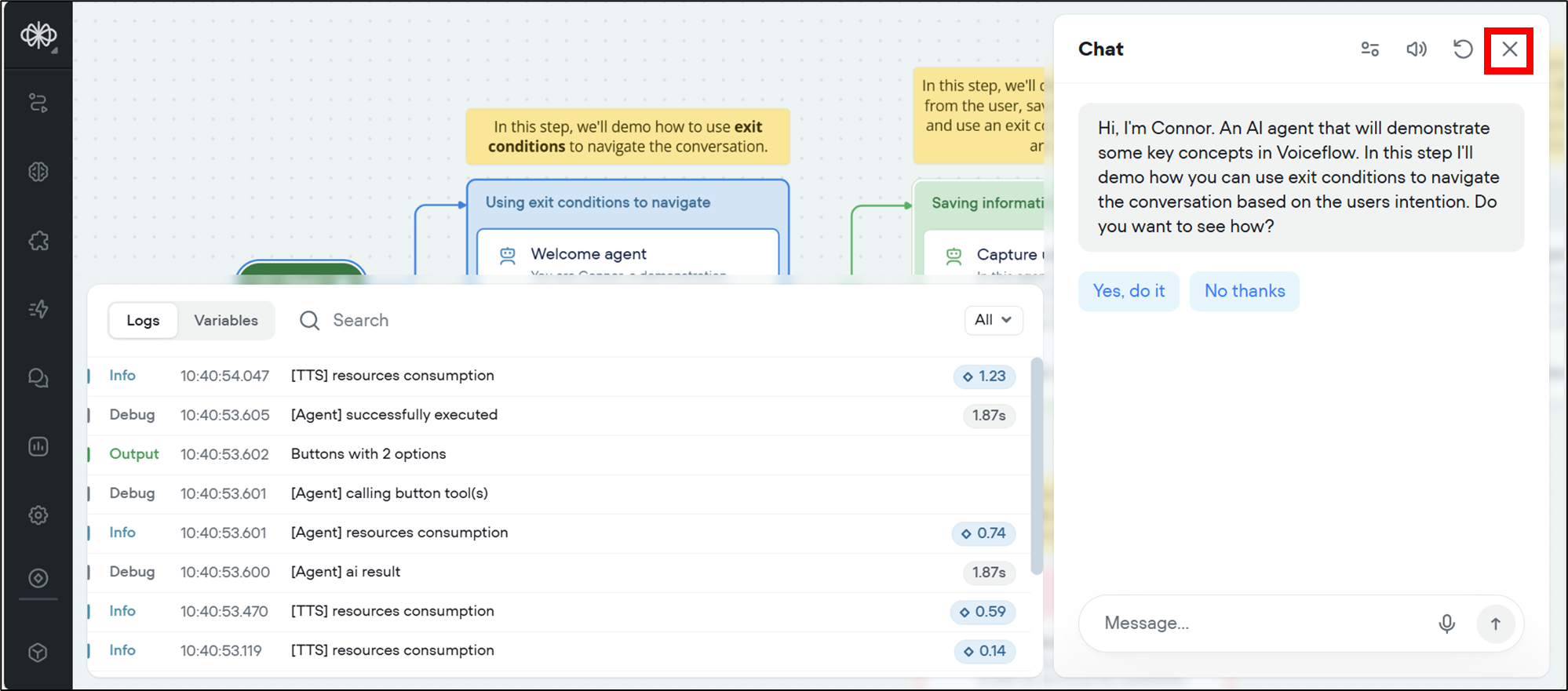 In the top left corner, you will find a menu options, such as go back to dashboard, share your prototype, and invite members. You can also run, test, and publish your agents from this dashboard.